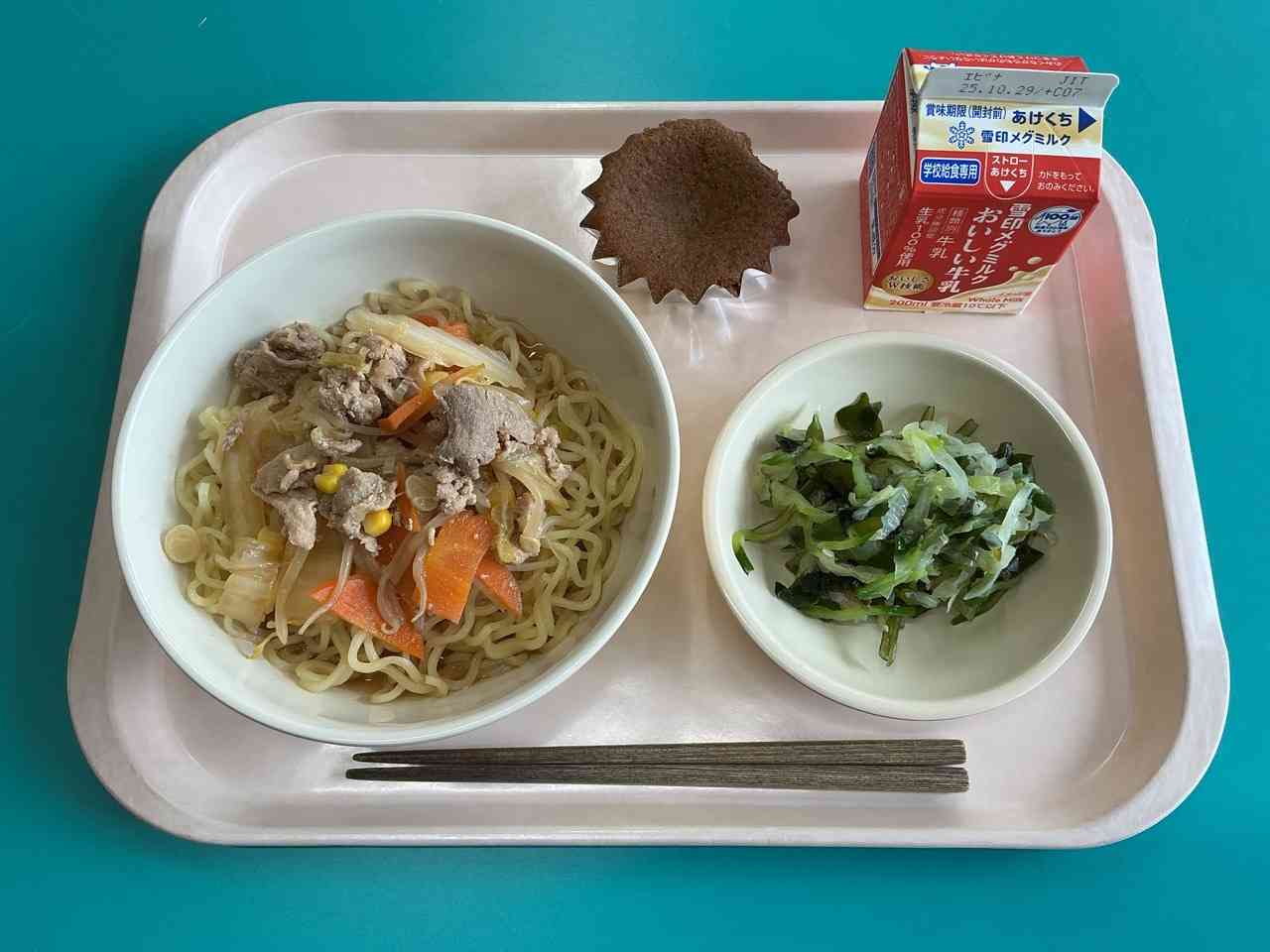 ◇みそラーメン ◇かいそうサラダ(ちゅうかドレッシング) ◇てづくりひがしやまとしさんこうちゃケーキ ◇ぎゅうにゅう