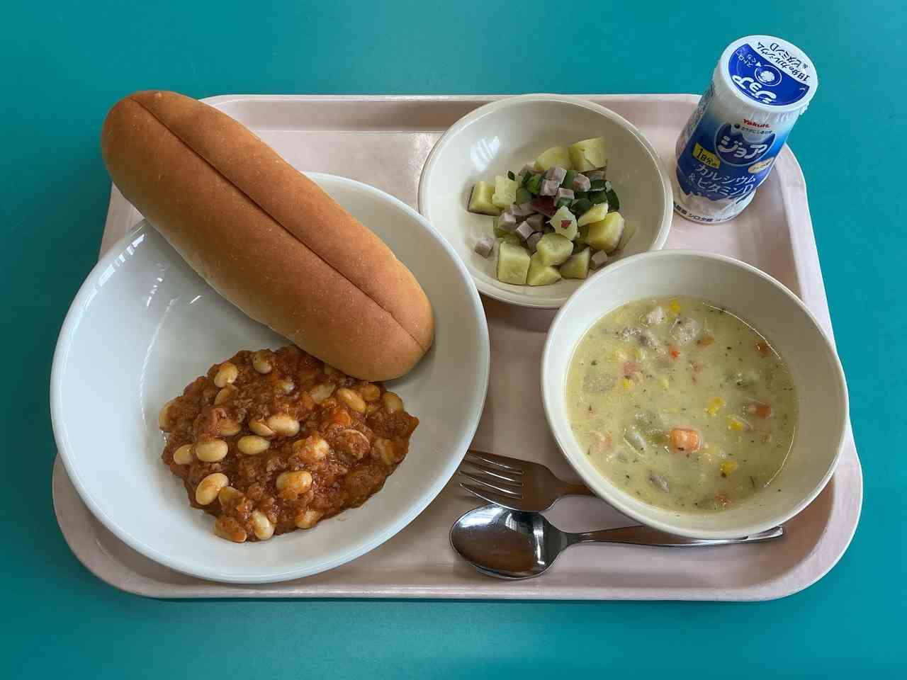 ◇チリコンカンドッグ(せわりミルクコッペパン、チリコンカン) ◇とうにゅうコーンチャウダー ◇さつまいもサラダ(ノンエッグマヨネーズ) ◇ジョア
