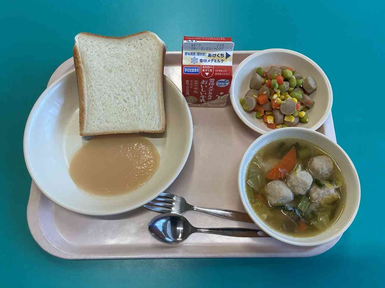 ☆あさやきしょくパン(ももジャム) ☆はくさいとにくだんごのスープ ☆コロコロソテー ☆ぎゅうにゅう