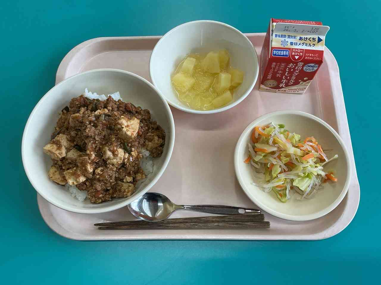 ☆マーボどうふどん ☆はるさめサラダ(たまねぎドレッシング) ☆パインかん・レモンゼリー ☆ぎゅうにゅう