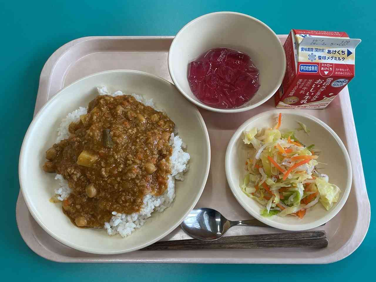 ◇むぎごはん ◇ガルバンゾーカレー ◇じゃこいりだいこんサラダ(かんきつドレッシング) ◇ぶどうゼリー ◇ぎゅうにゅう