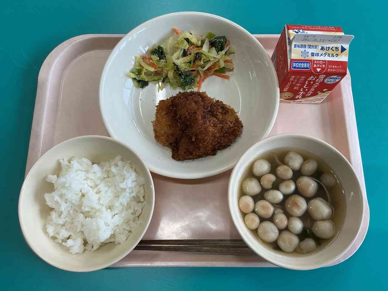 ◇ごはん ◇こづゆ ◇あいづソースカツ ◇ごまあえ(ごまドレッシング) ◇ぎゅうにゅう